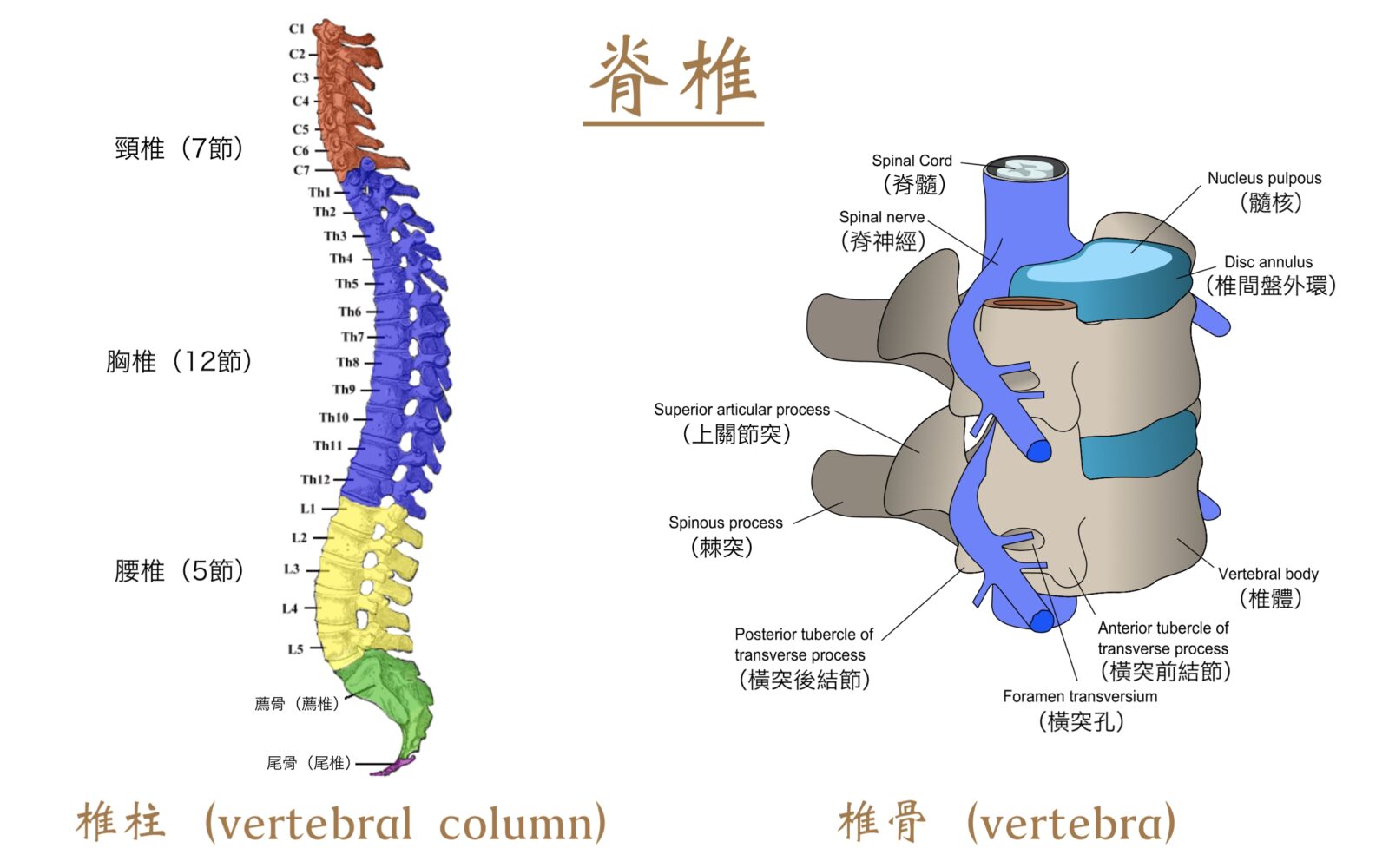 - 胸椎(Thoracic vertebrae):12節