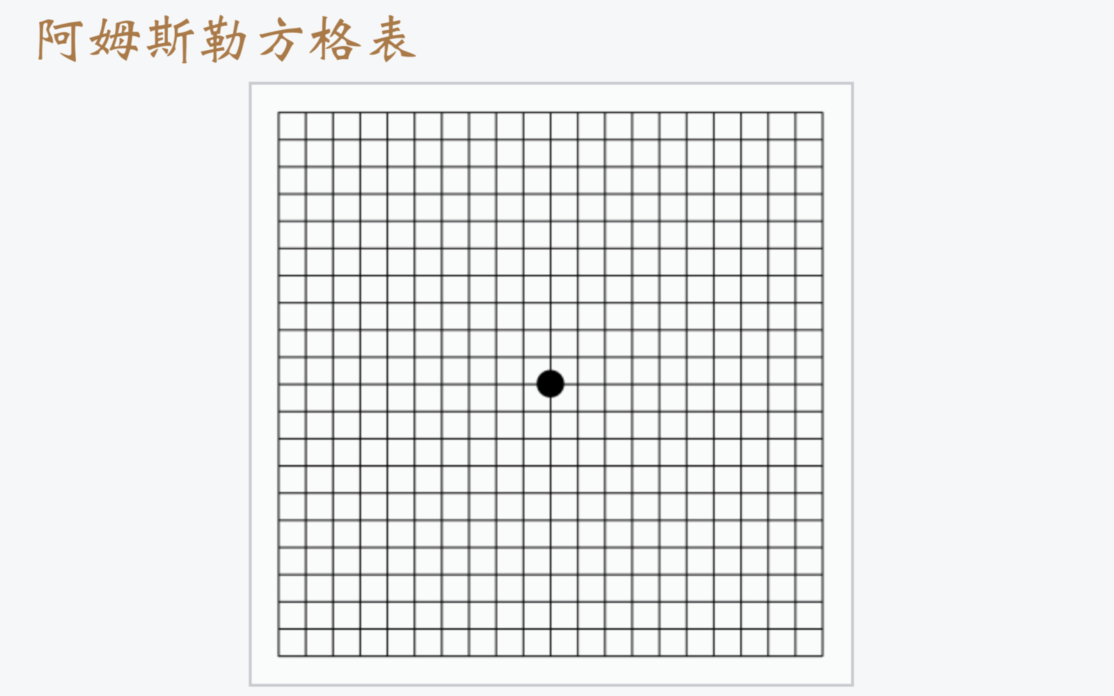 •)正常觀看方格為棋盤狀直線;若出現畫面模糊、扭曲或黑點擴散等非直線狀態,應儘速前往眼科診查。