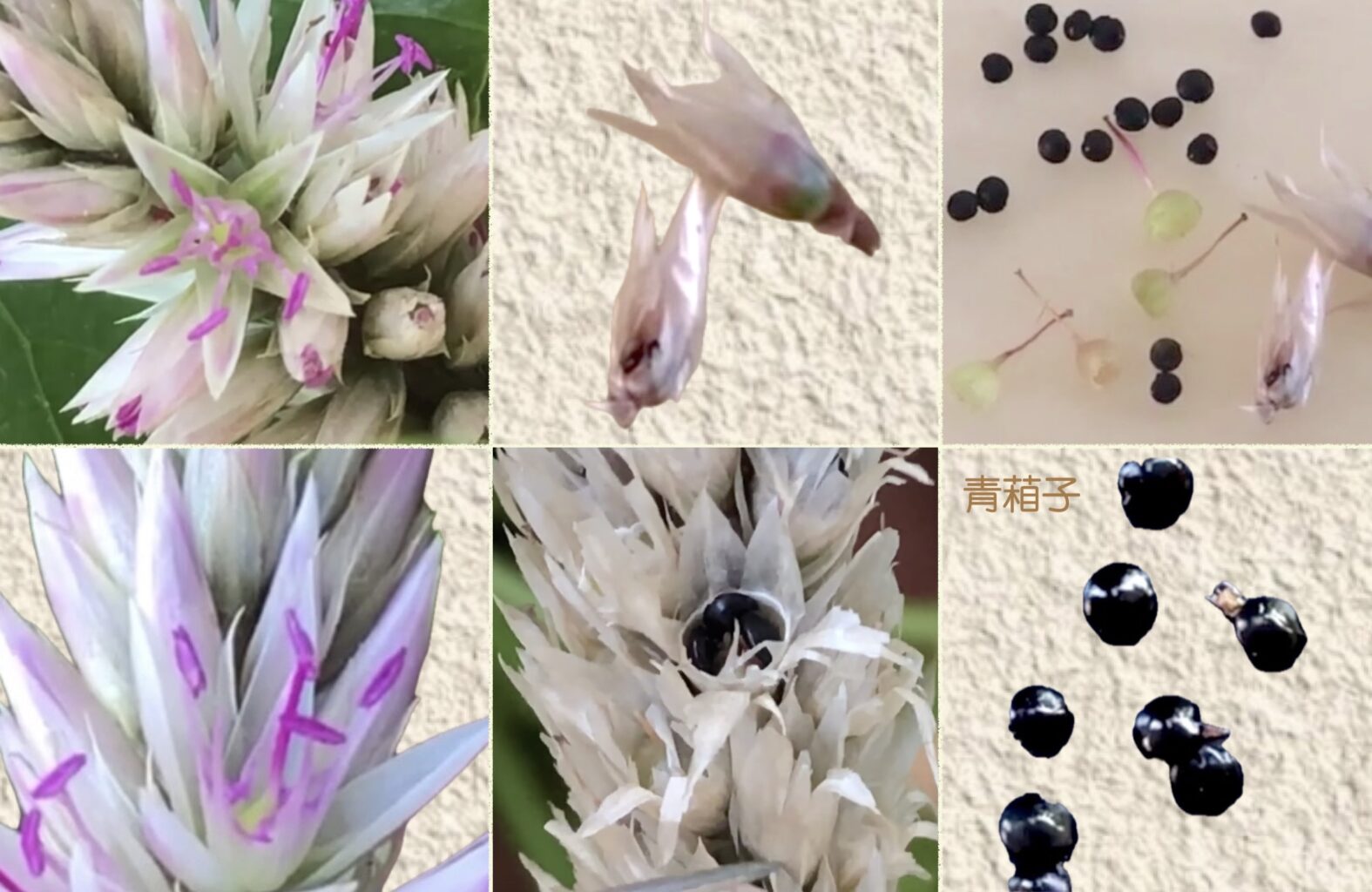 青葙的花朵有柄,頂生或腋生,穗狀花序呈披針或直立圓柱狀,雌雄同株,花序長 5~8公分;花期:5~8月。青葙的果實球形,約 0.3~0.4公分,成熟後橫裂,種子小粒,凸透鏡狀腎圓形,黑色具光澤;果期 6~10月。
